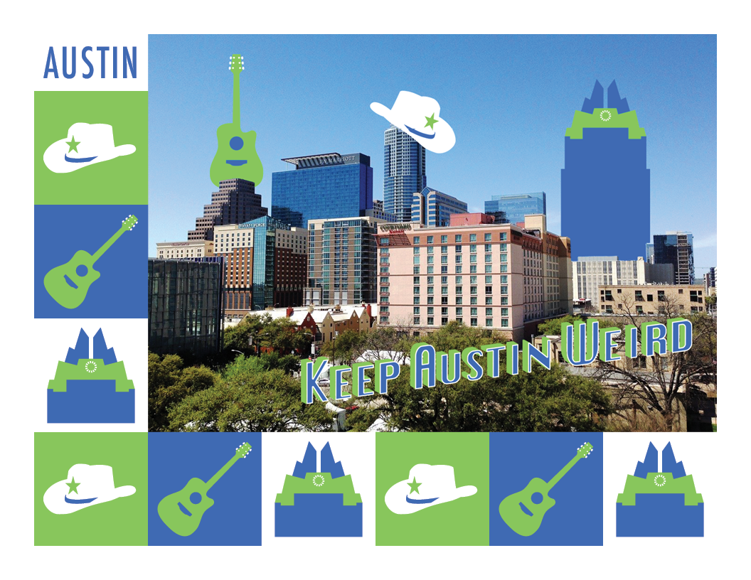 Objective: Create a pop culture travel poster for visitors to Austin by creating 2-3 graphics that represent the city and incorporate the graphics into a poster designed however you choose.