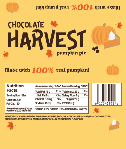 This project was done around the time of Thanksgiving, so my teammate and I opted for a chocolate-pumpkin-pie bar, although they aren't a common combination. The small details on the wrapper were made to be reasonable, excluding some jokes.