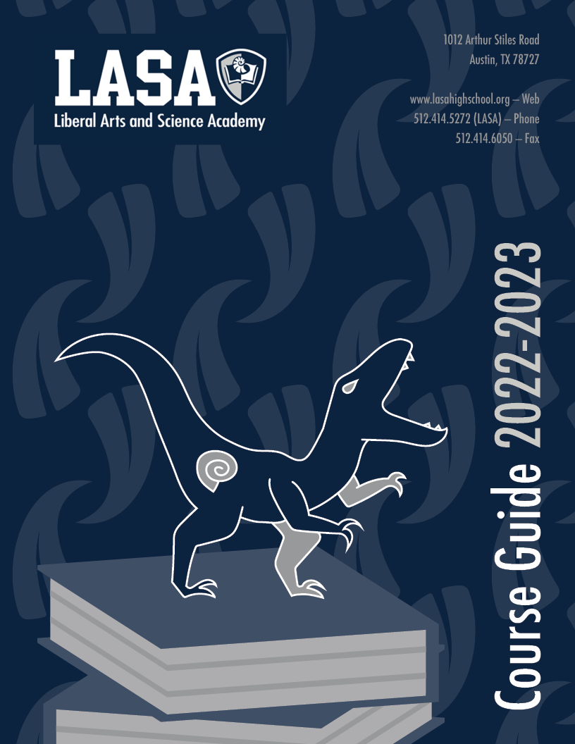 I did my best to stay consistent with the previous course guide design while minimizing the number of colors used. The LASA logo, colors, and fonts were styled in accordance to the official style guide as much as possible. I decided that a stack of books under the raptor would be fitting for a school context, and I used a repeating pattern of claws in the background to add some visual interest.
