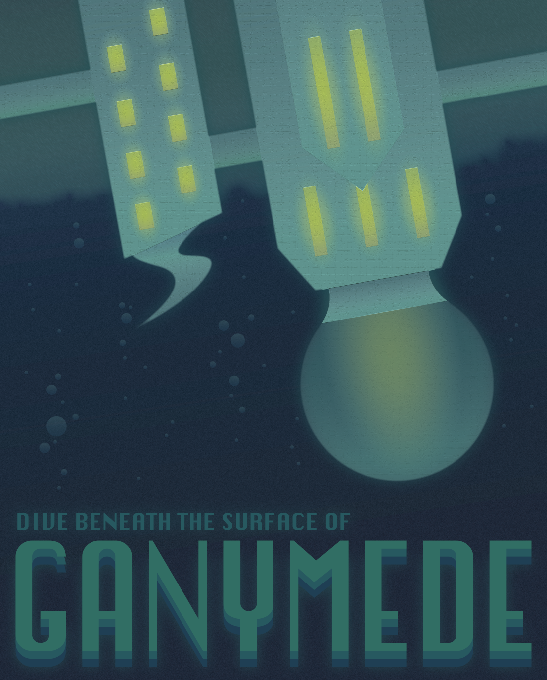 What caught my attention about Ganymede, the largest moon of Jupiter (and the largest moon in the solar system!), is that its surface is a thick layer of ice, but there are vast oceans that lie underneath. So, my idea for a futuristic civilization on Ganymede was one which built upside-down cities under the ice, which would put them underwater.